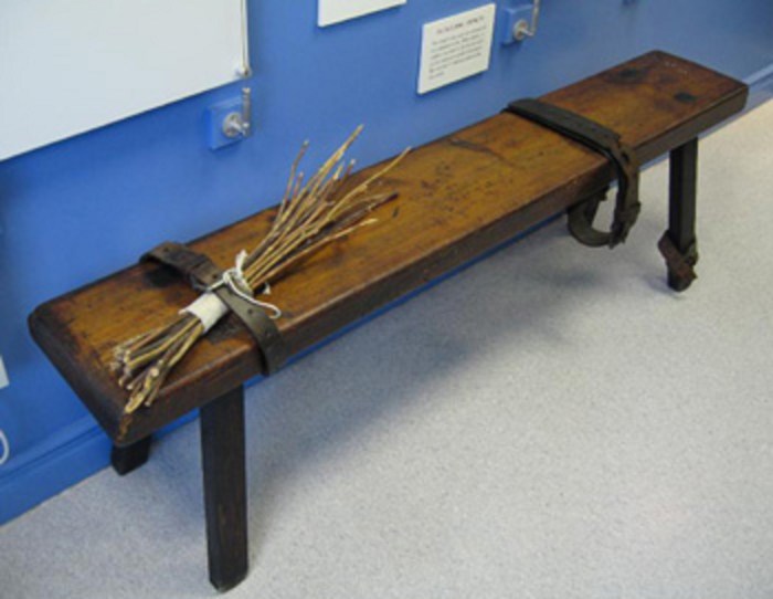 Flogging women with rods on a bench