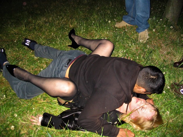 Drunk woman a bottle in the ass