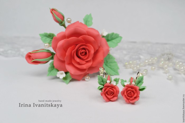 Flowers made of polymer clay coral color